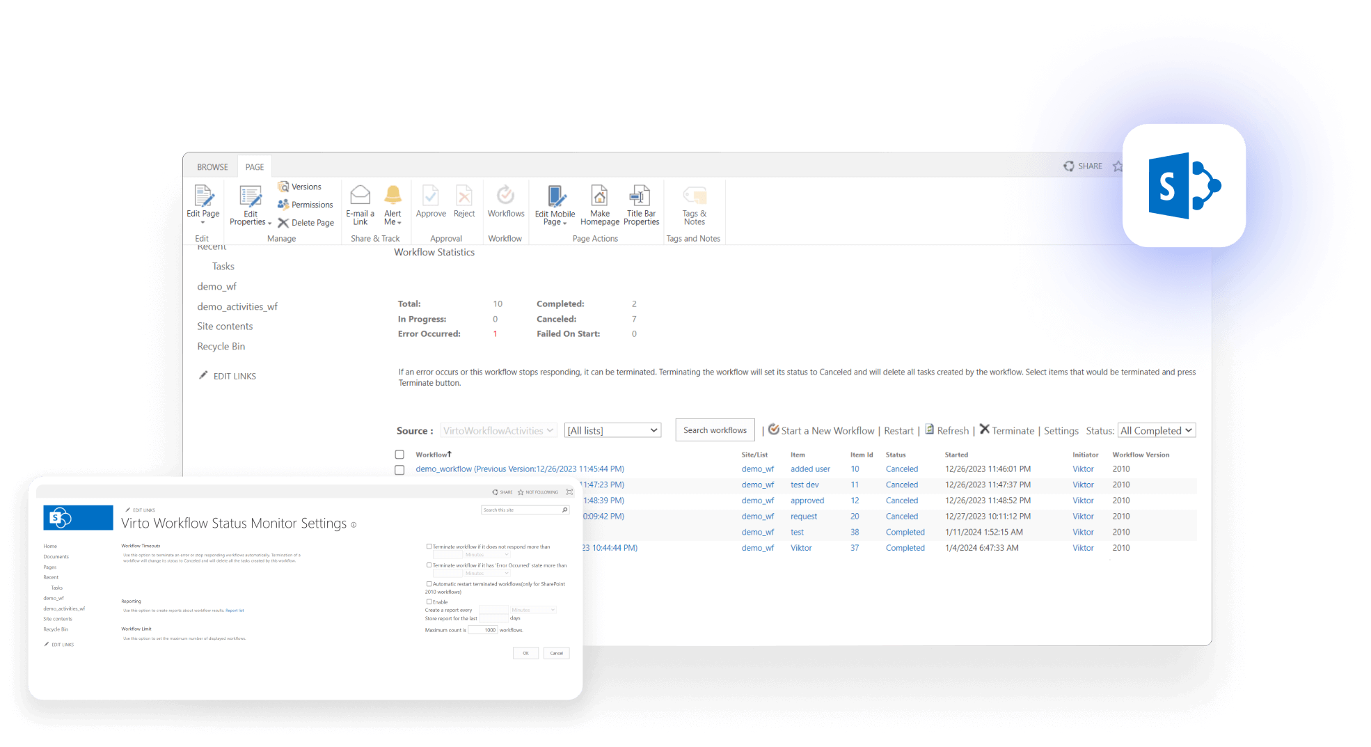 - Virto Workflow Status Monitor Web Part — a visual console that shows all running workflows on a site and their current state (in progress / error), so admins can track and manage processes directly from SharePoint—no custom scripts required. Compatible with SharePoint Server 2016/2019.